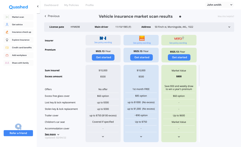 Quashed gives users a single view of all their insurance policies, helping them keep on top of how much they are spending, the amount they are protected for, and presents alternative insurance options at renewal time. Family members can be added to a user’s profile for quick and secure access to their insurance information.